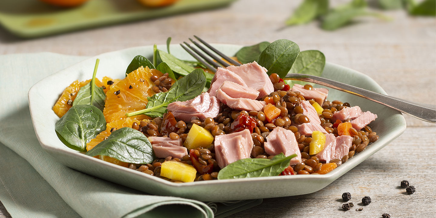 HomeRecipesInsalatissime Lentils with baby spinach and slices of oranges
