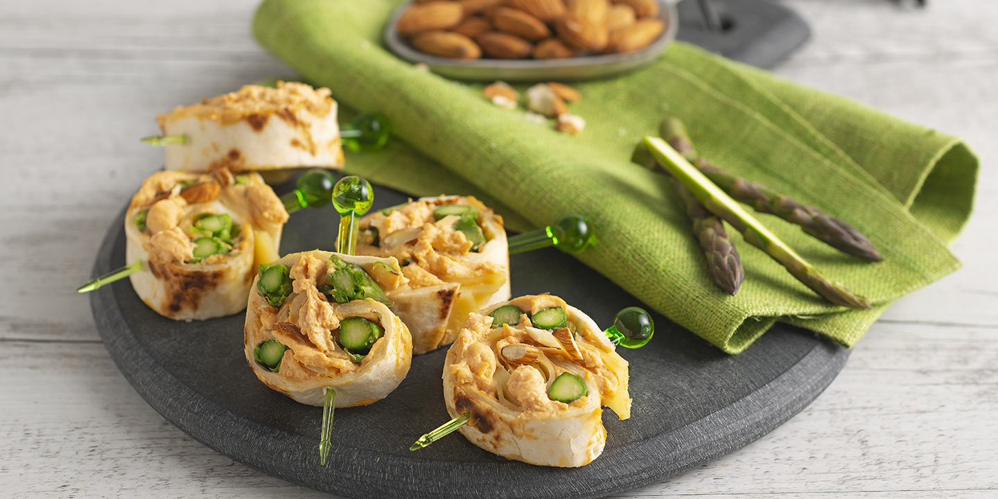 1. Chop coarsely the almonds; lay the slices of emmenthal on the wraps, then place the asparagus tips and squeeze the Rio Mare Pâté Pink Salmon over it.