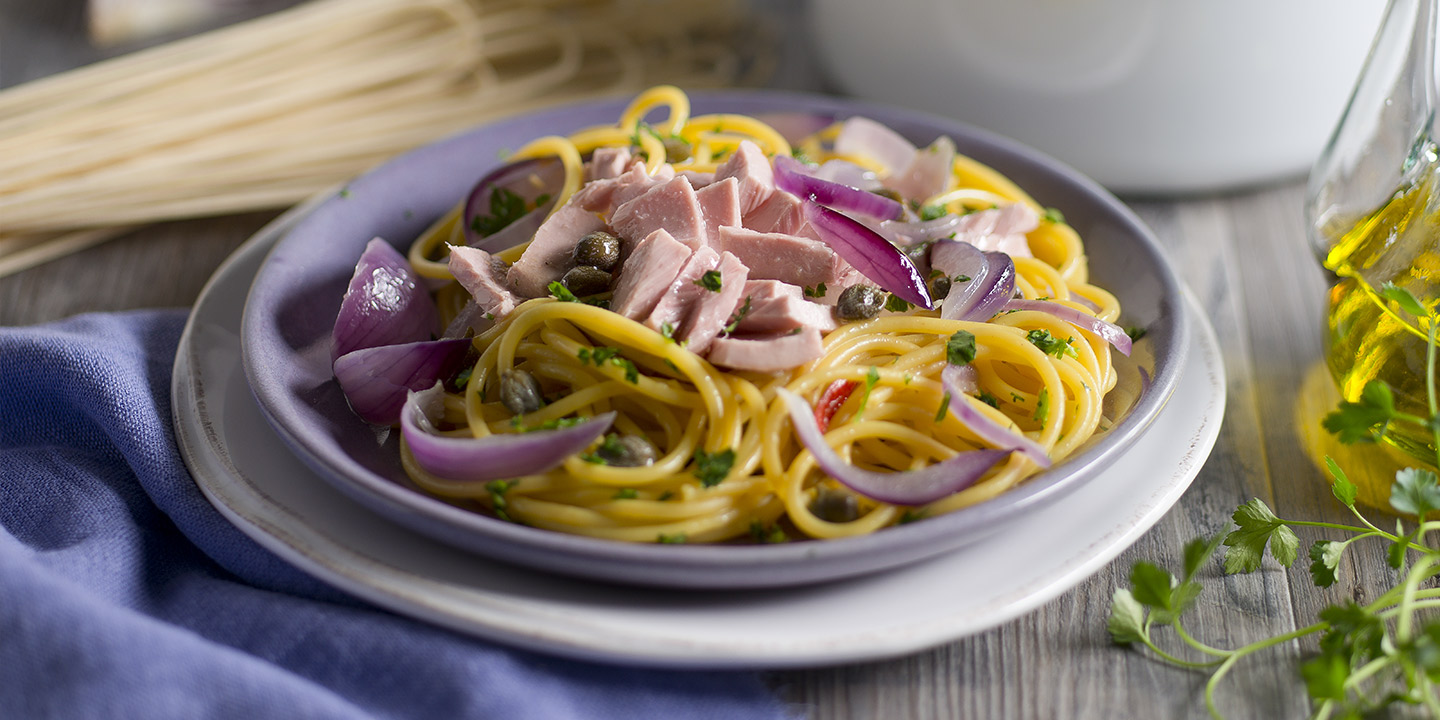 3. Sauté the garlic and onion with the oil and hot chili pepper in a large skillet. Add the capers and the tuna with a little of its olive oil.