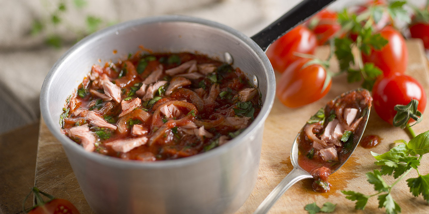 2. Add the tomato purée, season with salt and cook for about ten minutes. Add the drained tuna and the chopped aromatic herb, stir all the ingredients together for about one minute and remove the sauce from the flame.