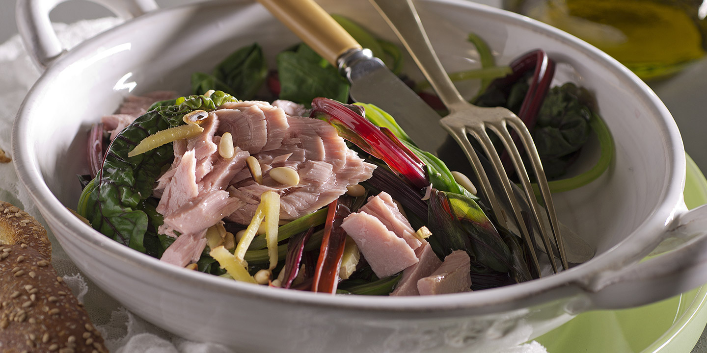 3. Remove the garlic, lay the chard on a plate, add the tuna and serve with toasted seeded bread.